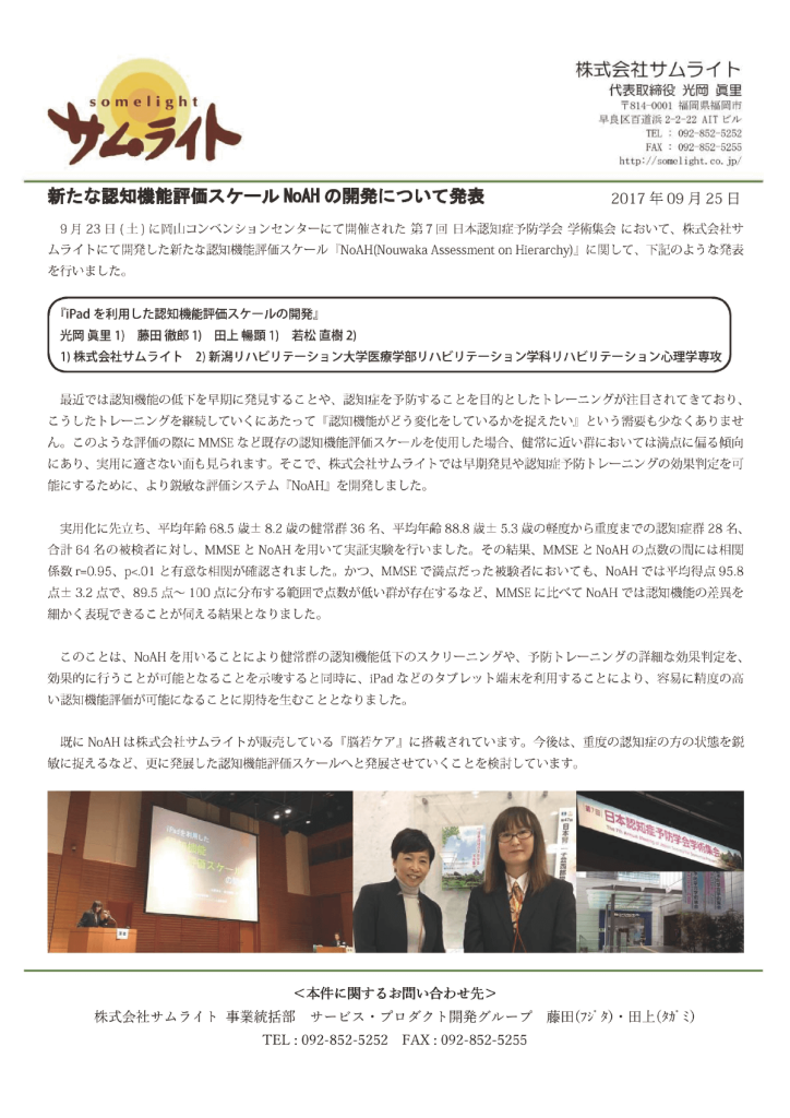 2017年9月23日(土)に開催された「第7回 日本認知症予防学会 学術集会」において、新たな認知機能評価スケール『NoAH(Nouwaka Assessment on Hierarchy)』の開発について発表しました。